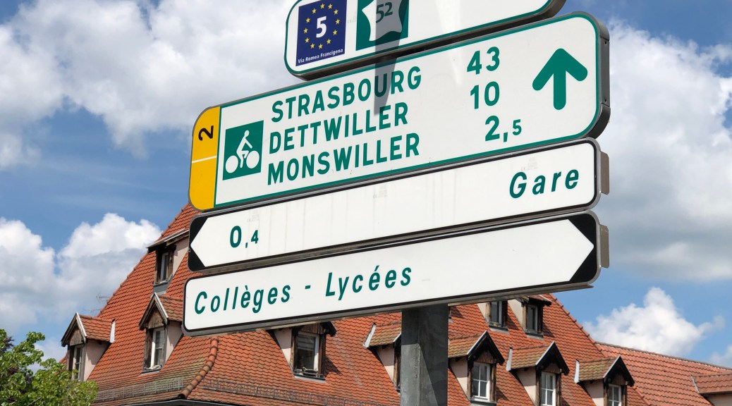 The climbing started almost immediately – and lacking a granny gear the incessant descent into a valley and small town followed by a horrific climb, was torture to watch as Lamby tackled them. In the distance the Vosges loomed – and tbh, sun aside, it was a bit terrifying. Through descent and climb after descent and climb we moved closer to the hills. The target of safety being the town of Saverne.