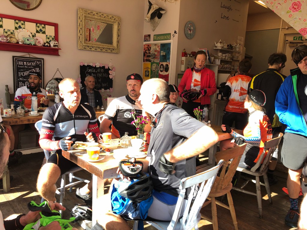 - The fund-raising – a woman pulled up in her car next to a group of us yesterday – wound the window down – we were expecting the customary Cyclist’s are w*ankers abuse. Instead – she said she had Multiple Sclerosis and wanted to say Thank you. For me that alone has made this challenge worthwhile. On that – here’s the link. https://www.justgiving.com/fundraising/DavidMcTeague?utm_campaign=lc_frp_share_transaction_transactional_%7C%7C_donation_received_%7C%7C_nth_donation&utm_content=cbca342e-e192-4ad4-ba03-ccc6fe9b4e48&utm_medium=email&utm_source=postoffice&utm_term=1567588208505