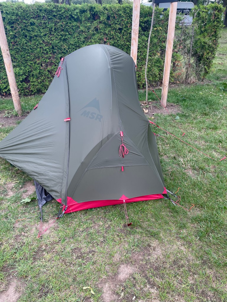 I made it finally to my campsite, set up camp, new tent, new set up, in a storm, what can go wrong… then headed off to the local decathlon for camping gas and shop for pasta and wine. That was another 14 windy miles. I am broken. But I have ravioli and wine. Ciao