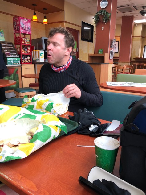 I awoke at 05:00 to the sound of rain, thunderous, massive rain – and from inside my tent it sounded like the sky was falling in. So much so in fact that I held in the loo visit that was urgently required for another 4 hours!!. At 07:30 Lamby and myself shouted to each other through our tents and agreed that we should stay indoors so to speak, for a while until the rain subsided – we fell back asleep and when I woke again at 10:30 – bursting – it was still pouring. We had little choice and decided to de-camp, get on the bikes somewhere warm in Dunkirque and make a plan. We chose Subway to be our office..